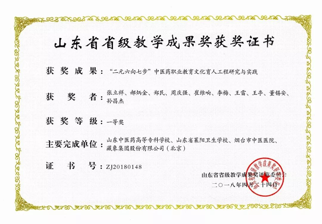 在多年嚴(yán)謹治學(xué)的發(fā)展之路上,以藏象集團董事長孫昌杰為首的核心高管團隊,積極推進職業(yè)技能技術(shù)特色課程研發(fā)、重構(gòu)課程體系、打造核心科學(xué)化的課程體系。董事長孫昌杰同時作為山東中醫(yī)藥高等??茖W(xué)校校企合作委員會副主任,在2018年教育部組織的教學(xué)成果評選活動中與其他幾位學(xué)校領(lǐng)導(dǎo)、負責(zé)人一同參與,實踐教學(xué)成果“二元六向七步”中醫(yī)藥職業(yè)教育文化育人工程研究與實踐斬獲山東省教學(xué)成果獎一等獎、國家級教學(xué)成果獎二等獎的殊榮。